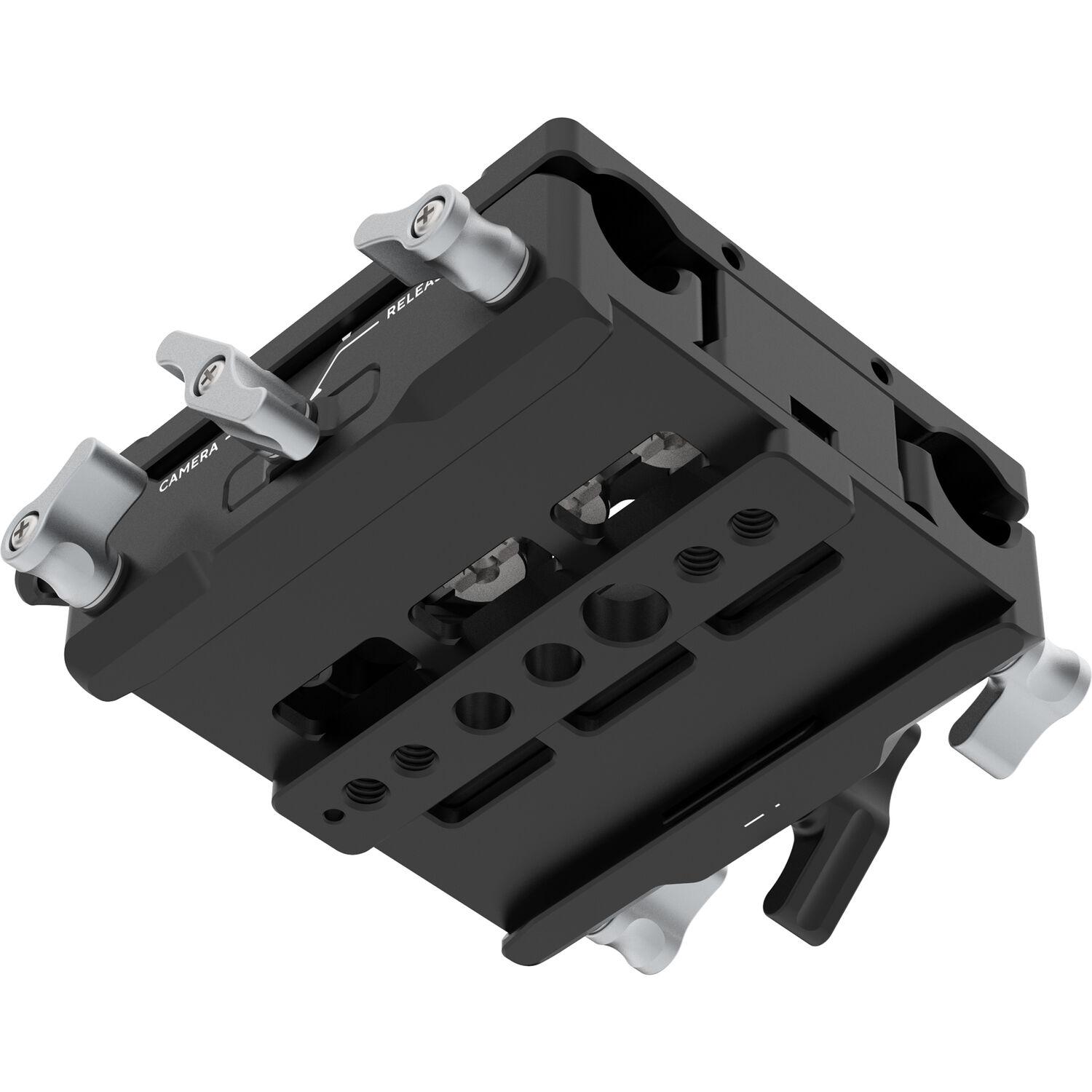 The quick release camera plate features 1/4"-20 and 3/8"-16 mounting screws, front M4 screws for a lens support, and rubber padding on top to protect the camera from scratching or twisting. The dovetail base offers 1/4"-20 and 3/8"-16 tripod mount threads. Its 15mm rod ports pass through the entire base and are secured with four locking levers, making it easy to add two sets of optional rods of different lengths through the front and rear. The bridge plate features a standard 3.3" riser height to match the camera's lens height, and optional riser plates will be available to support additional camera models.