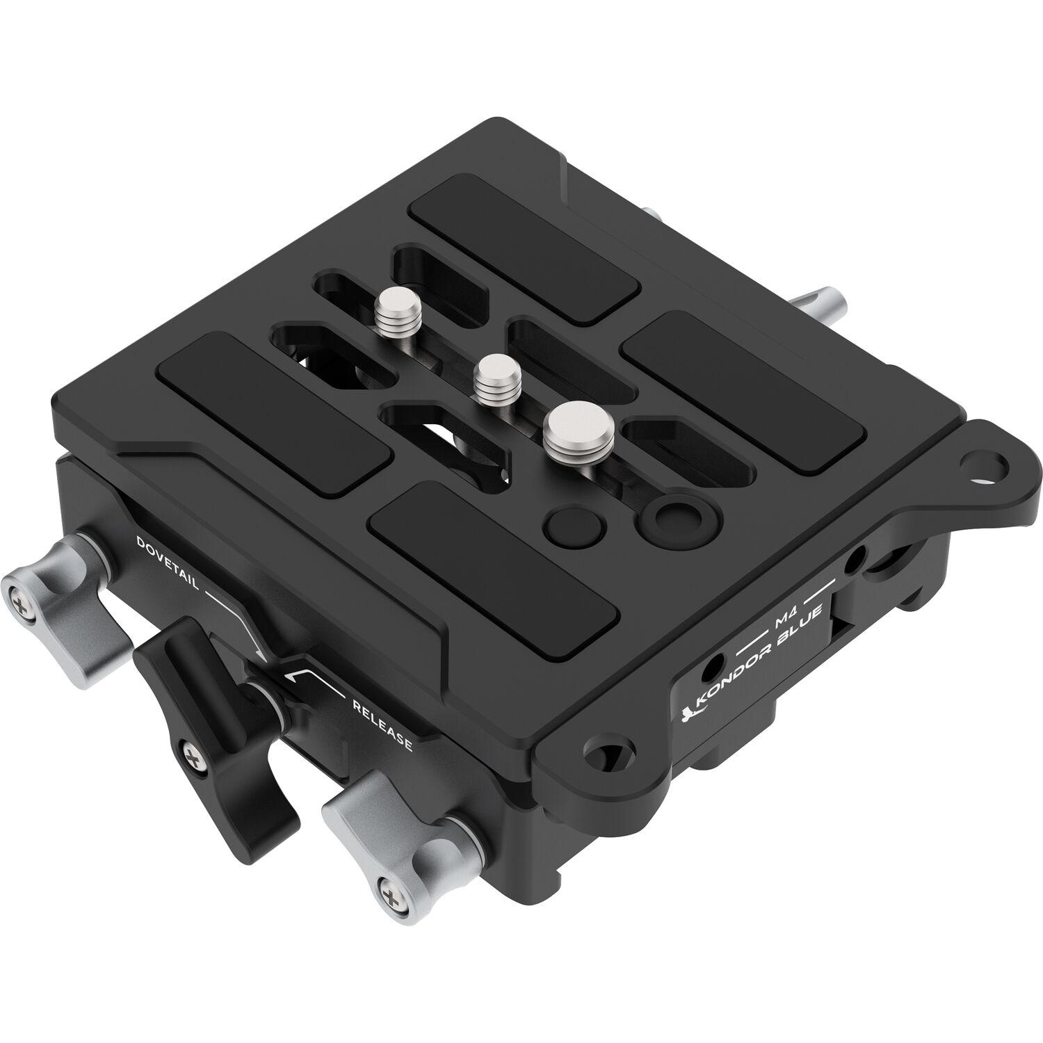 Add 15mm LWS and quick release support to your professional camera rig with this 15mm LWS ARRI Bridge Plate from Kondor Blue. The bridge plate is designed to work with ARRI-standard dovetail rigs and can support larger pro cameras from ARRI and RED cameras, as well as models such as the ALEXA Mini, Blackmagic Design URSA Mini line, Pocket Cinema Camera 6K Pro, RED KOMODO, Canon EOS C70, and the Sony FX6, FX3, FX30, Rialto, FS5, F5, and VENICE. It features an ARRI-standard dovetail base, a quick release camera plate, and a 15mm LWS rod system.