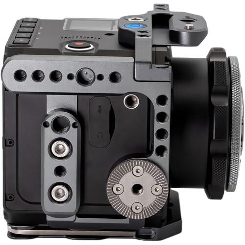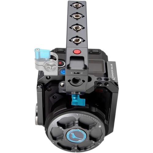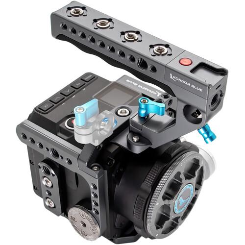 The cage offers a rosette mount on the side, a cable clamp, an integrated NATO rail on the top, left, and right, and a bubble level. It provides 1/4"-20 accessory threads, 1/4"-20 and 3/8"-16 tripod mount threads, and anti-twist ARRI Accessory Mounts, which can also be used as standard 3/8"-16 threads. The rosette mount comes attached on one side of the cage, while an optional second one can be installed on the other side to support grip handles. Additionally, the cage has front-facing M4 threads for mounting the optional Kondor Blue Speedbooster Bracket.