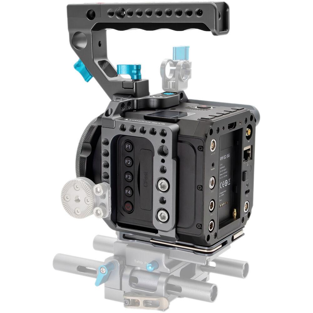 Kondor's Cage with Top Handle for Z Cam E2-S6, E2-F6, and E2-F8, in space gray, features an independent baseplate that secures to the bottom of the camera, and the rest of the cage attaches to the camera at other locations. Screws are supplied for this. The baseplate also has dedicated slots on the sides for keeping an included Allen key hidden away, so it can always be kept handy.