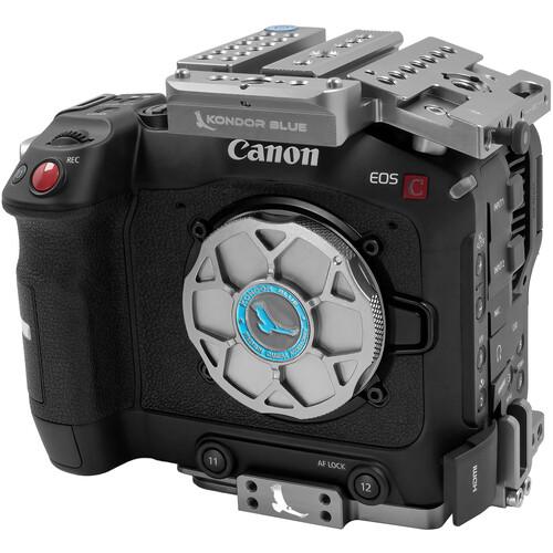 The cage offers an ARRI-style anti-twist thread on the side plate optional side handgrip or extension arm, it is compatible with the camera's original grip strap, and it features multiple 1/4"-20 threads. The top plate features 1/4"-20 threads, 3/8"-16 ARRI-style anti-twist mounts, two shoe mounts, a bubble level, and two integrated NATO rails. Other top plate features include a magnetic tool storage for tightening the screw mounts, and it relocates the sensor plane marker. It is compatible with the original Canon top handle or with the Kondor Blue Trigger Top Handle, and it also works with the Canon Mic Mount.
