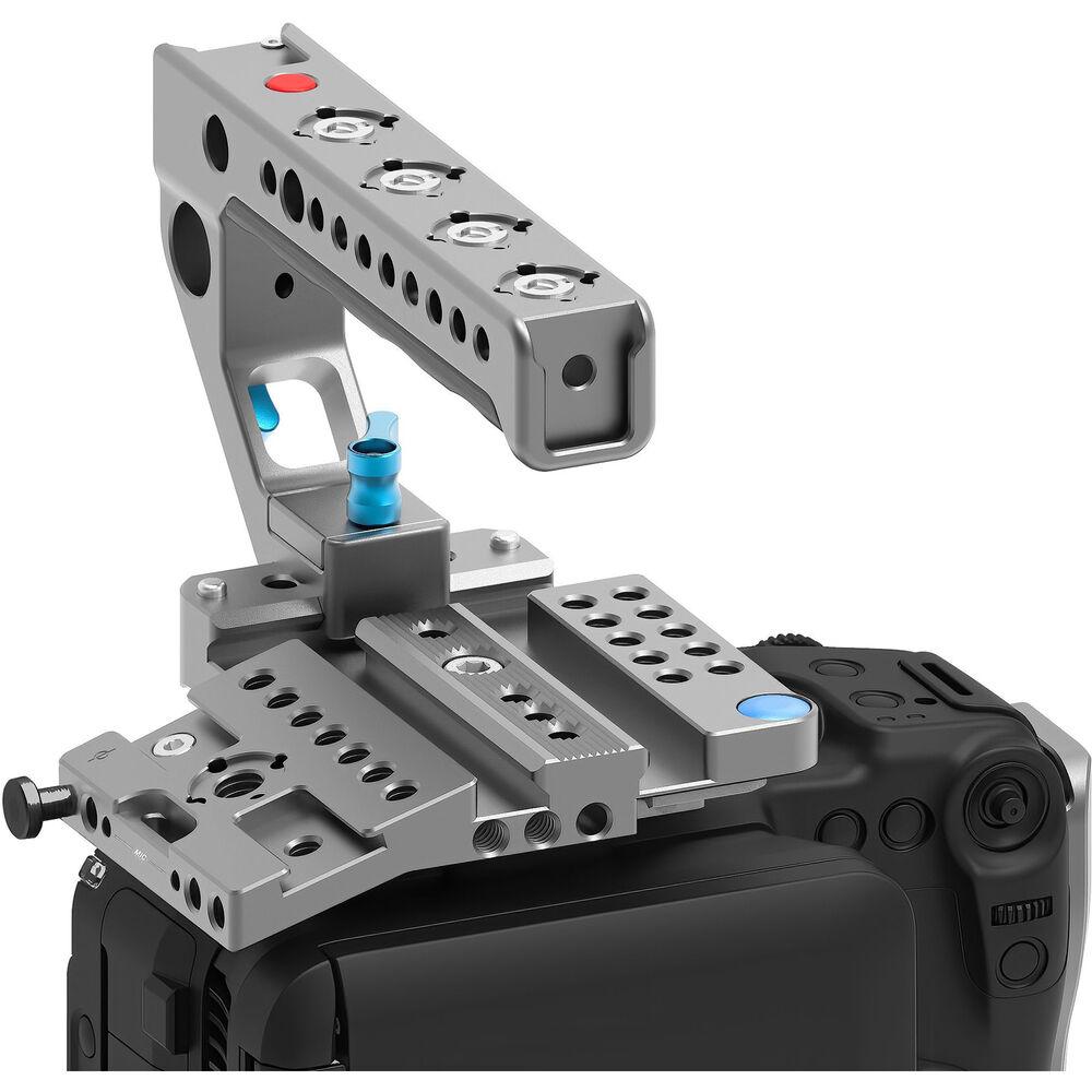 The cage components feature 1/4"-20 threads, 3/8"-16 ARRI-style anti-twist mounts, shoe mounts, a bubble level, M4 lens support threads, an HDMI cable clamp, NATO rails, and magnetic tool storage. The cheese-style top handle features shoe mounts, 1/4"-20 threads, and 3/8"-16 ARRI-style anti-twist mounts, and it mounts onto the top plate with its NATO clamp. It features a start/stop trigger button that connects to the camera with a separately available LANC cable.