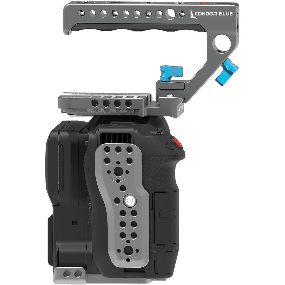 The cage offers an ARRI-style anti-twist thread on the side plate optional side handgrip or extension arm, it is compatible with the camera's original grip strap, and it features multiple 1/4"-20 threads. The top plate features 1/4"-20 threads, 3/8"-16 ARRI-style anti-twist mounts, two shoe mounts, a bubble level, and two integrated NATO rails. Other top plate features include a magnetic tool storage for tightening the screw mounts, and it relocates the sensor plane marker. It is compatible with the original Canon top handle or with the Kondor Blue Trigger Top Handle, and it also works with the Canon Mic Mount.