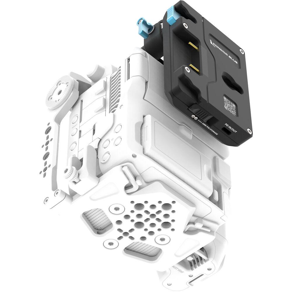 The raven black Pro Battery Plate with Swiveling Rod Block from Blue Kondor includes a variety of power output ports, along with a 100W USB-C PD port for both power output and input. The top of the plate boasts integrated magnetic power contacts for Kondor Blue Expansion Modules.
