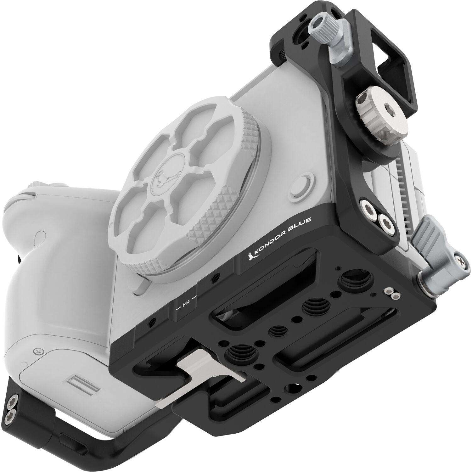 Around the cage are multiple 1/4"-20 and 3/8"-16 anti-twist threads, NATO rails on the left side and the removable right-side plate, and an integrated Arca-type baseplate provides quick mounting onto a separately available Arca-type receiver or DJI gimbals.