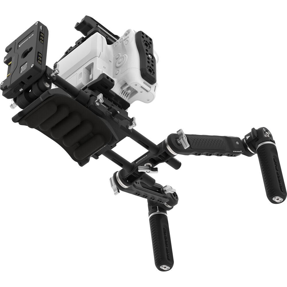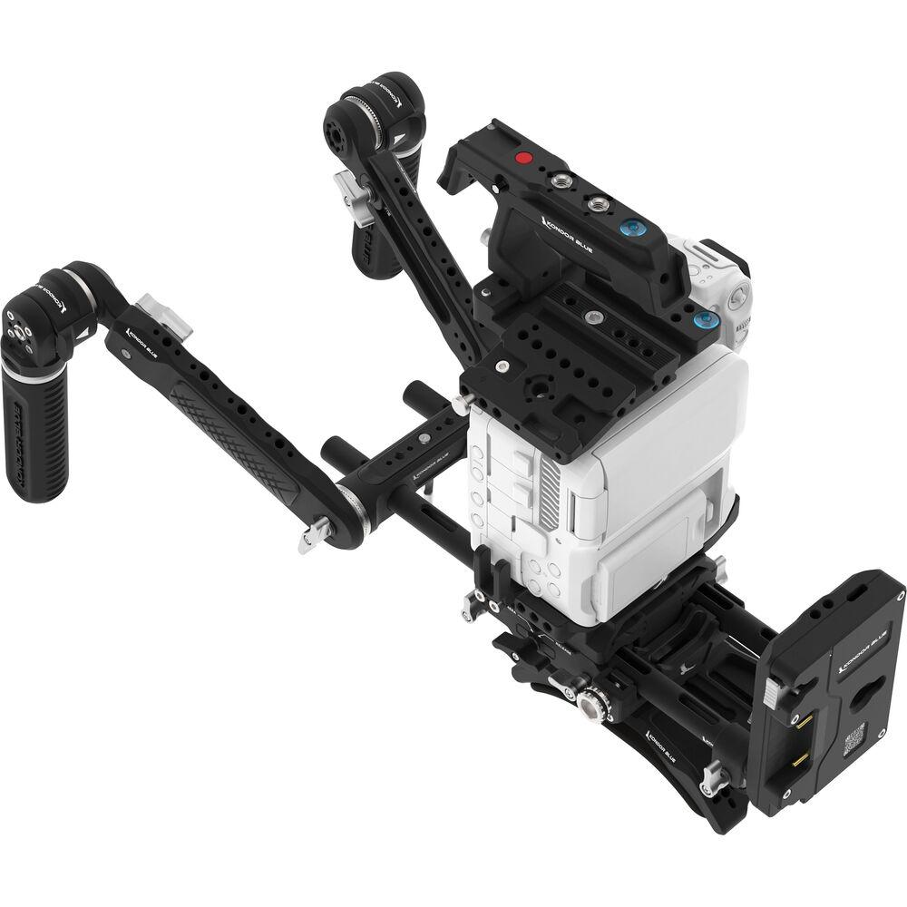 Add shoulder support, protection, power, accessory mounting, and a battery plate to your Canon EOS C70 camera with this Ultimate Rig MKII from Kondor Blue. This rig features a modular camera cage with a top handle, an ARRI-style baseplate, a Shoulder Pad Air MKII, a set of extension handgrips, a Gold mount battery plate, a pair of 12" 15mm rods, and a 15" D-Tap power cable. The included top trigger handle features multiple mounting options and a start/stop button that connects to the camera with a separately available LANC cable. Read more about these kit components below.