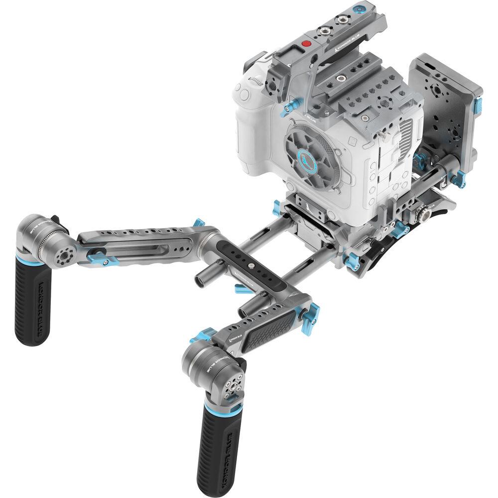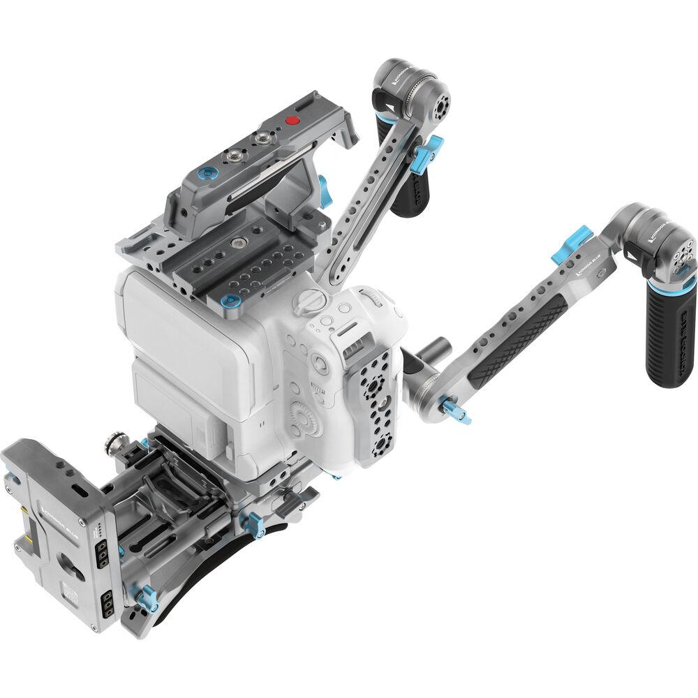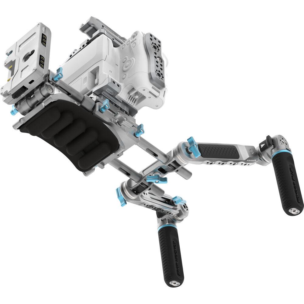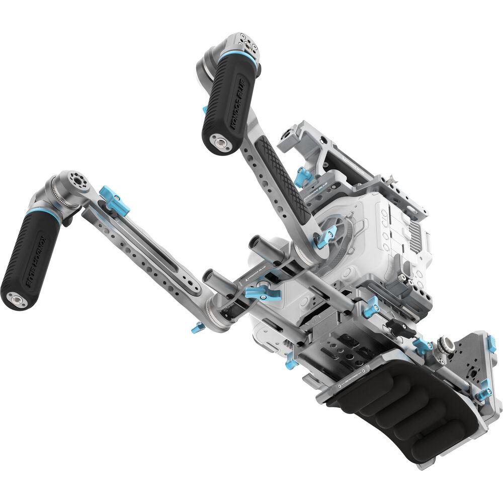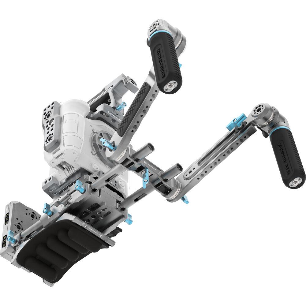 Add shoulder support, protection, power, accessory mounting, and a battery plate to your Canon EOS C70 camera with this Ultimate Rig MKII from Kondor Blue. This rig features a modular camera cage with a top handle, an ARRI-style baseplate, a Shoulder Pad Air MKII, a set of extension handgrips, a Gold mount battery plate, a pair of 12" 15mm rods, and a 15" D-Tap power cable. The included top trigger handle features multiple mounting options and a start/stop button that connects to the camera with a separately available LANC cable. Read more about these kit components below.