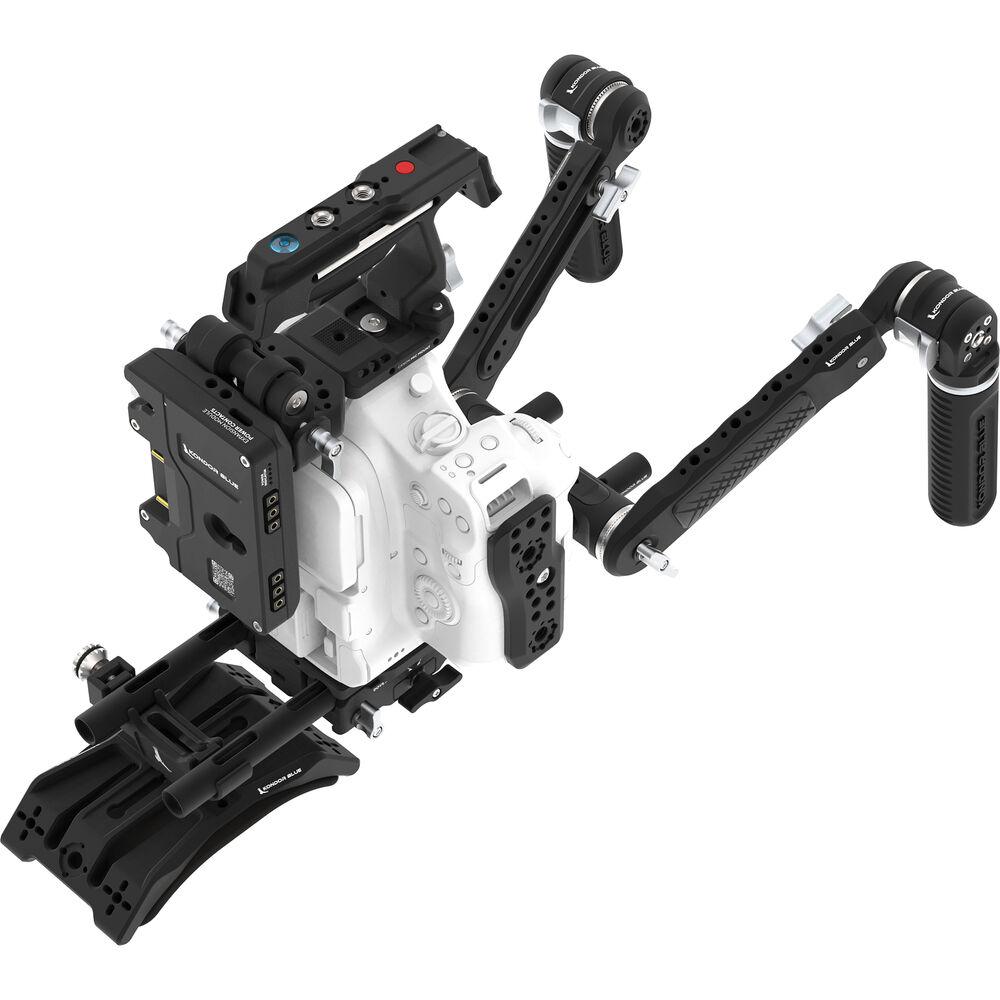 The Ultimate Rig with Gold Mount Battery Plate from Kondor Blue is designed to work specifically with the Canon C80. It bundles a modular camera cage, a Talon XL top handle, an ARRI-style 15mm LWS bridge plate, a set of extension handgrips, a Gold mount battery plate, an aluminum camera body cap, a side plate, and a pair of 12" 15mm rods. The included top trigger handle features multiple mounting options and a start/stop button that connects to the camera with a separately available LANC cable. Read more about these kit components below.
