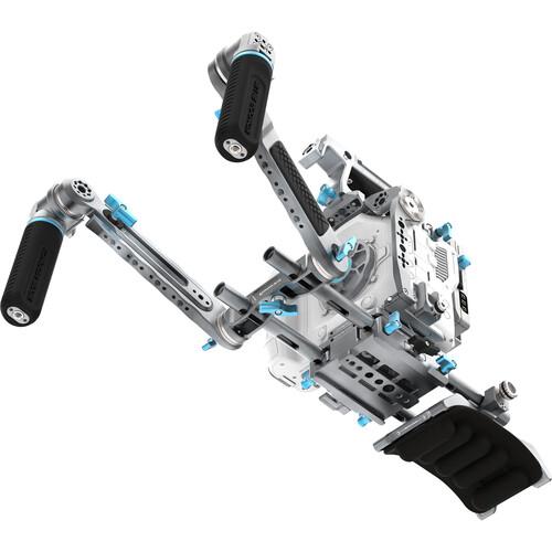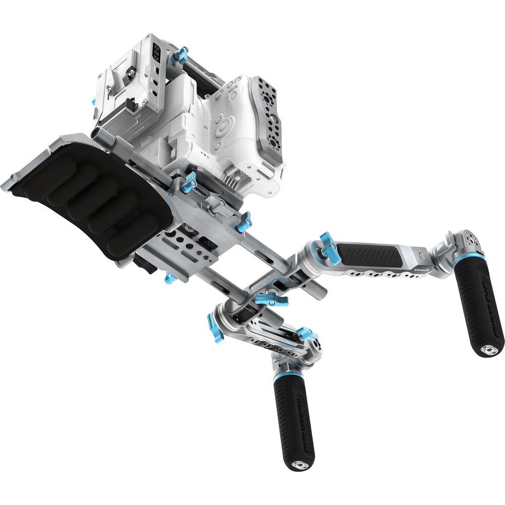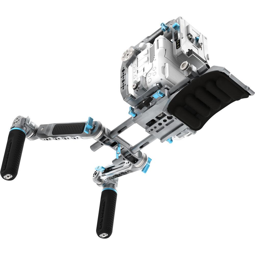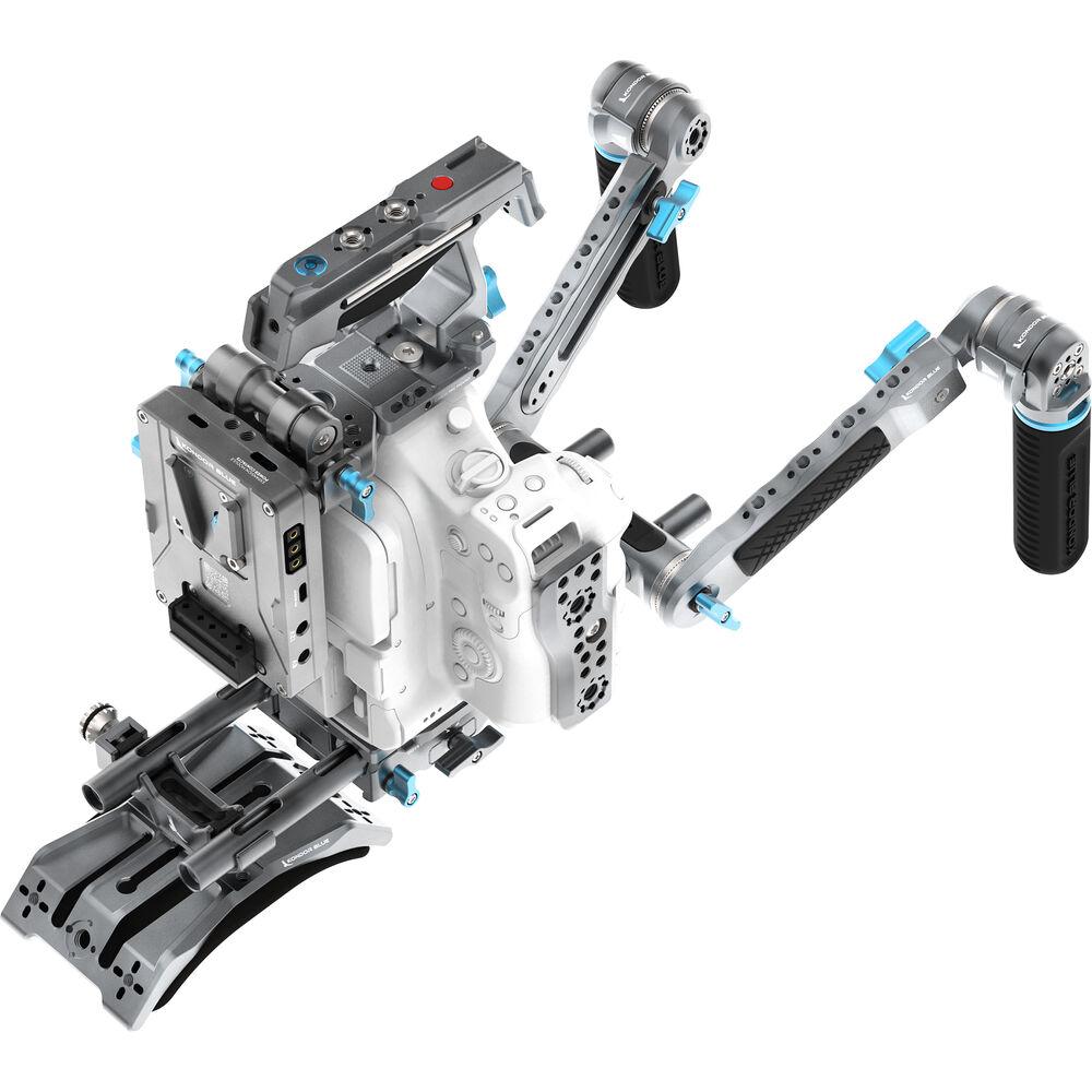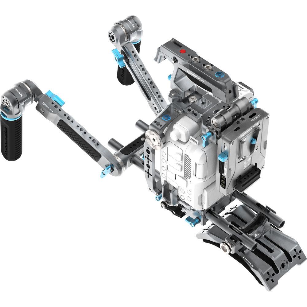 The Ultimate Rig with V-Mount Battery Plate from Kondor Blue is designed to work specifically with the Canon C80. It bundles a modular camera cage, a Talon XL top handle, an ARRI-style 15mm LWS bridge plate, a set of extension handgrips, a V-mount battery plate, an aluminum camera body cap, a side plate, and a pair of 12" 15mm rods. The included top trigger handle features multiple mounting options and a start/stop button that connects to the camera with a separately available LANC cable. Read more about these kit components below.
