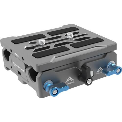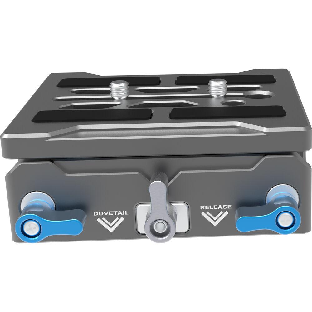 The quick release camera plate features 1/4"-20 and 3/8"-16 mounting screws, front M4 screws for a lens support, and rubber padding on top to protect the camera from scratching or twisting. The dovetail base offers 1/4"-20 and 3/8"-16 tripod mount threads. Its 15mm rod ports pass through the entire base and are secured with four locking levers, making it easy to add two sets of optional rods of different lengths through the front and rear. The bridge plate features a standard 3.3" riser height to match the camera's lens height, and optional riser plates will be available to support additional camera models.
