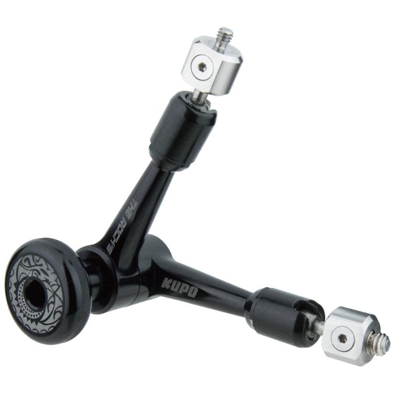 The 10in rock’s arm is a precise and versatile articulating arm that will support up to 17.6lbs and is designed for holding field monitors, recorders, led lights and microphones on camera rigs. The friction wheel controls ball-joint tension simultaneously, making the arm handy and convenient to operate. The ends are engineered for 360 degree rotation plus 90 degree pivoting that provides great versatility for easy positioning. One end features a 1/4"-20 male stainless steel accessory tip, and the other end a 3/8"-16 male stainless steel accessory tip. A unique taper engagement mechanism facilitates fine ball-joint adjustment even when tightened. This provides a great solution for different connection and mounting needs in video and film.