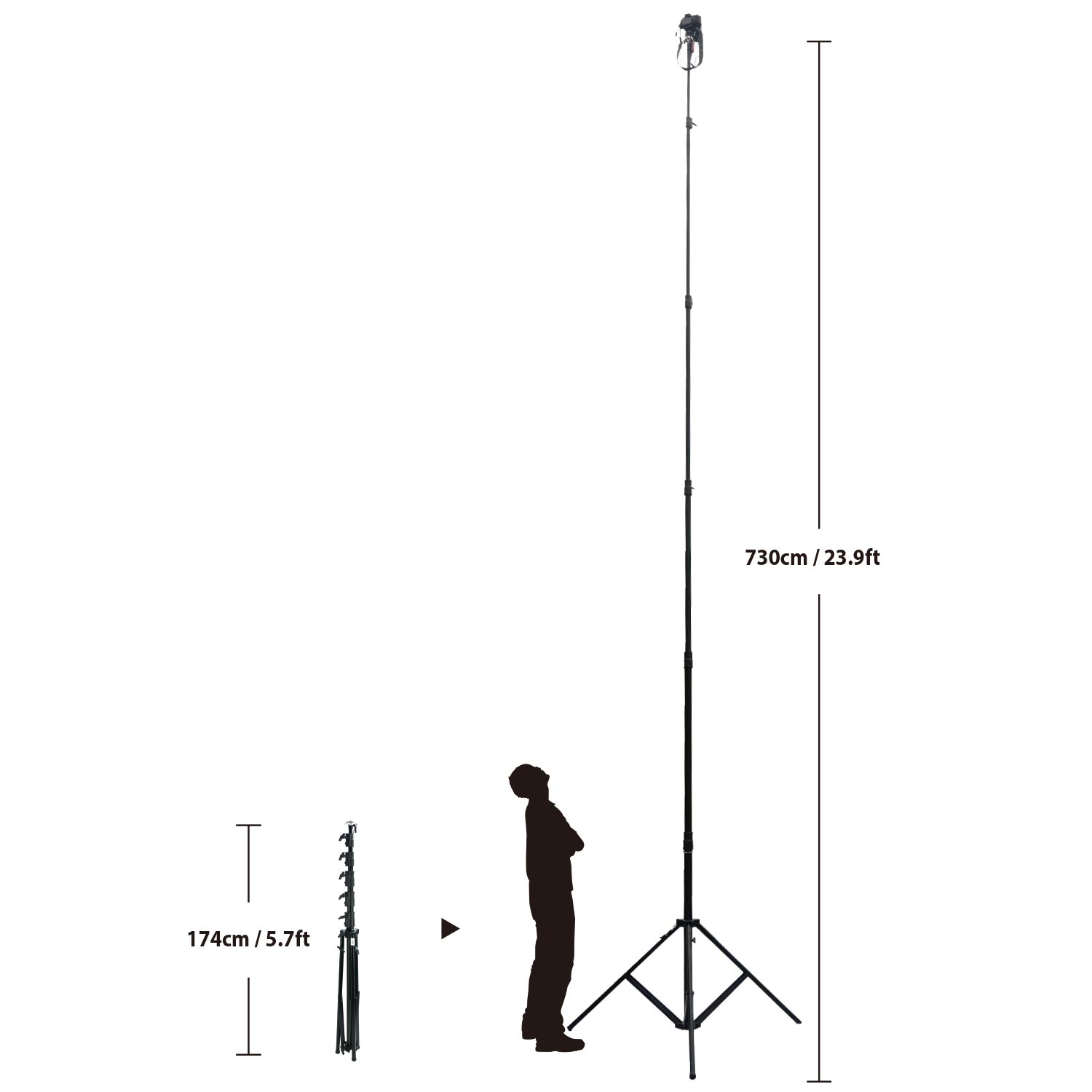 The 229MB High View features 5 risers and 6 column sections allowing you to mount your camera, or lighting accessory, anywhere between 1.9 and 7.3 meters. For an extra level of stability, the centre column can be lowered independently of the legs and hardware. This allows for a fourth point of contact with the ground with minimal effort. Each leg also has its own adjustment built in to ensure stable set up on un-even ground.