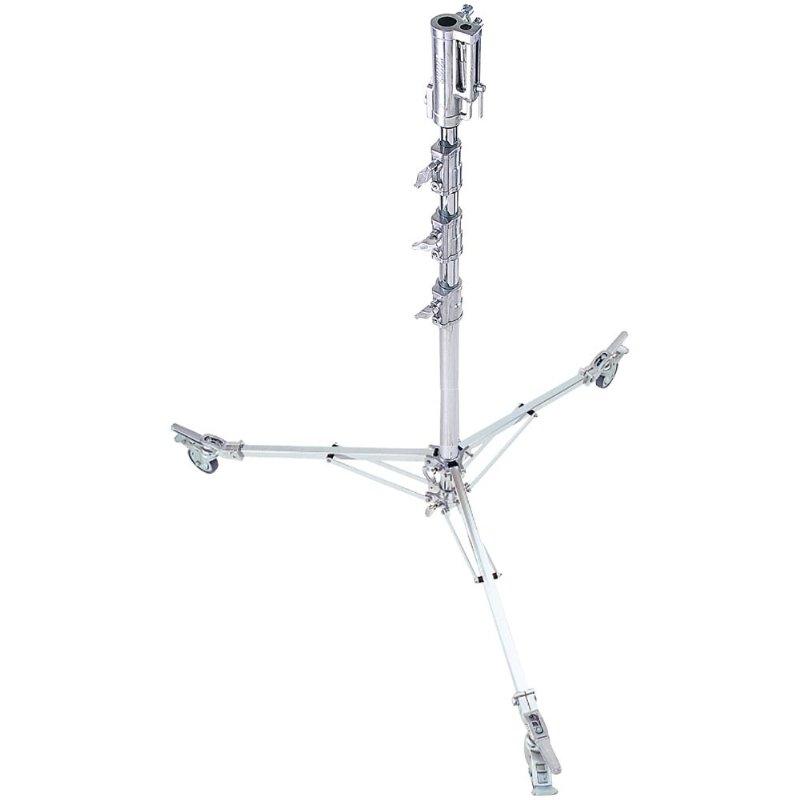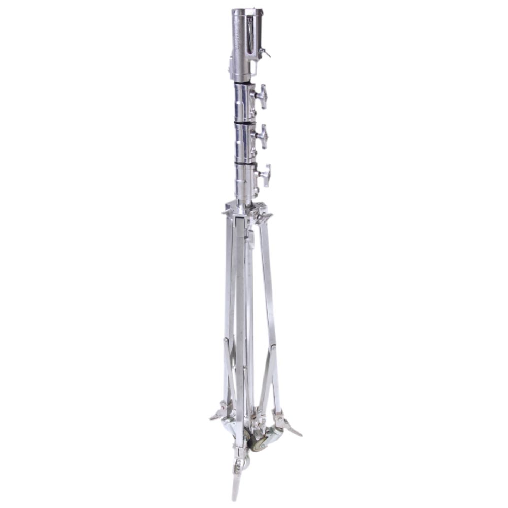 The High Roller Stand takes you higher and takes you mobile! Whether you are ounting a 10K Fresnel 14' (4.28m) in the air or you are flying a 20 x 20' (6.09 x 6.09 m) Butterfly frame, this stand is ready to meet your needs. Each riser is spring cushioned as a safety feature to protect lighting fixtures from a sudden drop if the locking collar becomes loose. The solid steel construction has a maximum load capacity of 88.2 lbs (40 Kg) and is equipped with braked casters to easily reposition heavy loads. Each caster is equipped with a peg that extends past the wheel allowing it to stand upright when collapsed. The High Roller Stand also features the triple function universal combo head with both 1-1/8" (28 mm) and 5/8" (16 mm) receivers plus a multi-direction 5/8" (16 mm) stud to accept any kind of mounting challenge.