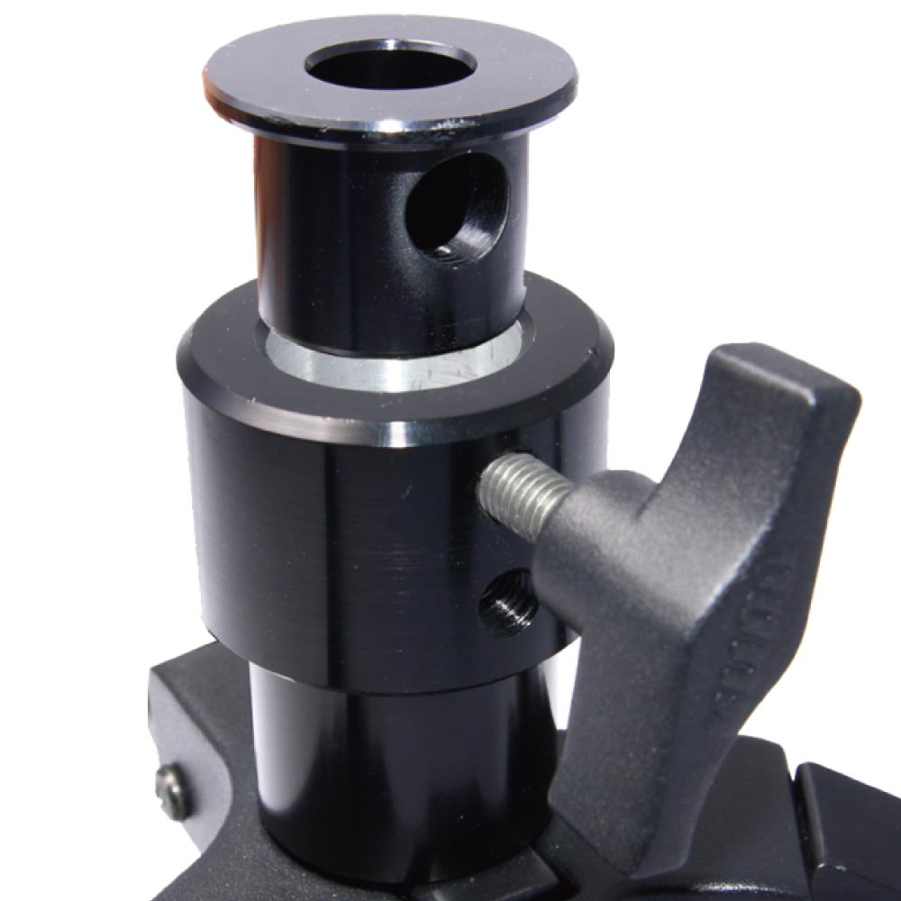 Low profile, lightweight compact folding floor stand. Constructed with anodized aluminum legs and central column with die-casting leg mounts. Designed for a 28mm spigot, or a 16mm spigot with supplied adapter.