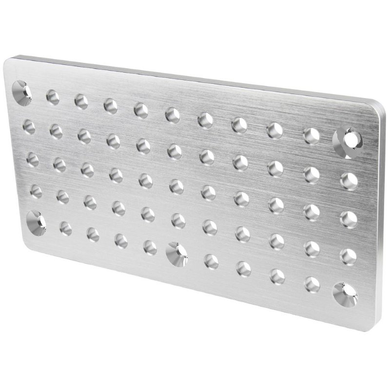 Constructed from a cnc made aluminum plate withholes as a multipurpose utility bracket for various film related accessories. Specially design for mounting related accessories to cameras, monitors and lighting. It comes withthe industry standard 3/8” holes, spaced every 1”. The four corners are counter-sunk 82 degrees on one side.