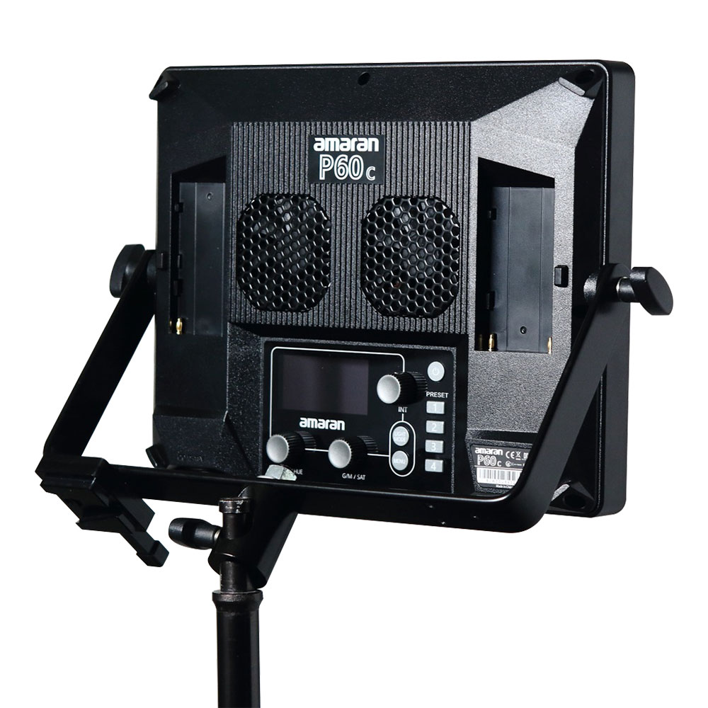 The tailor-made aluminum yoke with black coating is special designed for apture amaram p60c that allows you tilt your led panel effortlessly. It features a v-lock base mounted on the yoke offers an ideal mounting solution for v-mount battery when the ac power is not available on locations. The 3 way 5/8”(16mm) baby receiver equipped also enables mounting in either vertical or horizontal configuration. The unique design of oblique hole makes you have an additional 35 degree tilt for eliminating barn door interference when positioning you led lighting on a stand.