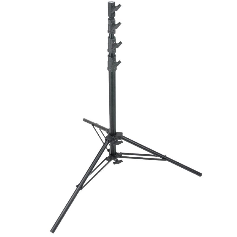 This 12.5' (3.85m) light stand has all metal locking collars to the twin leg braces for additional support. Assembled with nuts and bolts as opposed to rivets, giving the user a solid light stand that could easily be self-serviced as well as tension adjusted to the user's preferences. The mounting stud is attached with two cross pins at right angles to prevent any movement. With precision manufacturing the risers are supported with a cushion of air for slowly letting the risers come down at a very slow pace so as not to damage your lighting equipment.