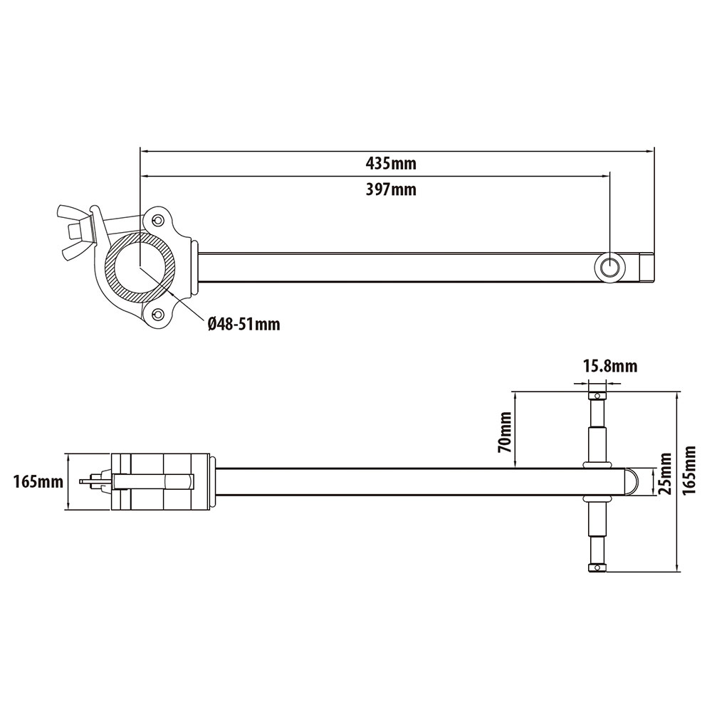 This arm consists of a heavy-duty clamp on one side and opposing double baby (5/8- 16mm) pins on the other. It can be mounted quickly to the riser section of a light stand at any height to accept a light fixture or any accessory with a baby receiver. Fits tubes with diameters of 2" (51mm) with a total length 15" (380mm).