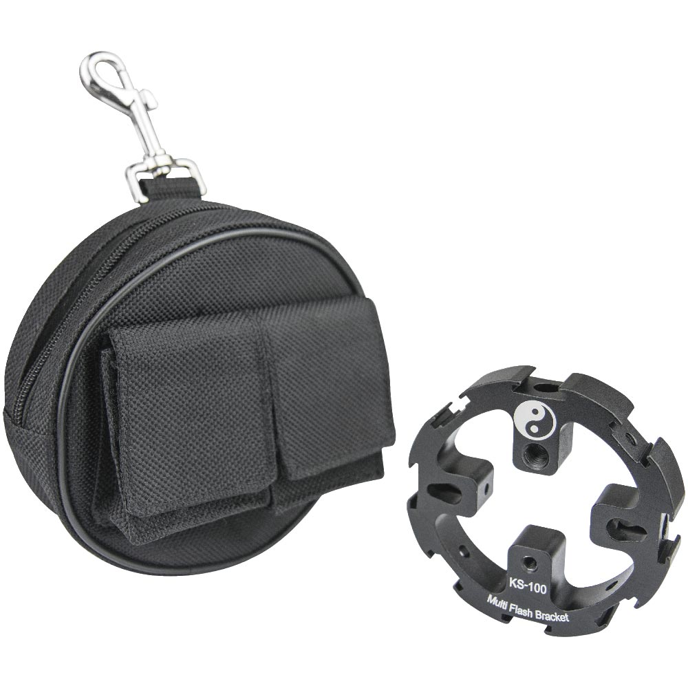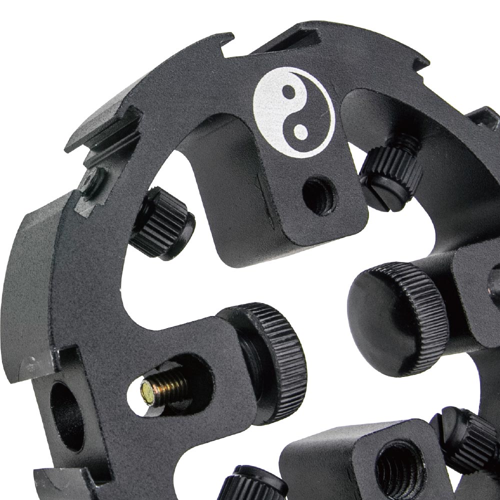 The Kupo bagua multi-flash bracket is a palm sized, lightweight, black anodized, 6061 aluminum bracket withe ight speedlight mounting locations. The bracket will accommodate four speedlights on it's own or up to eight speedlights withsome optional extension flash adapter set.