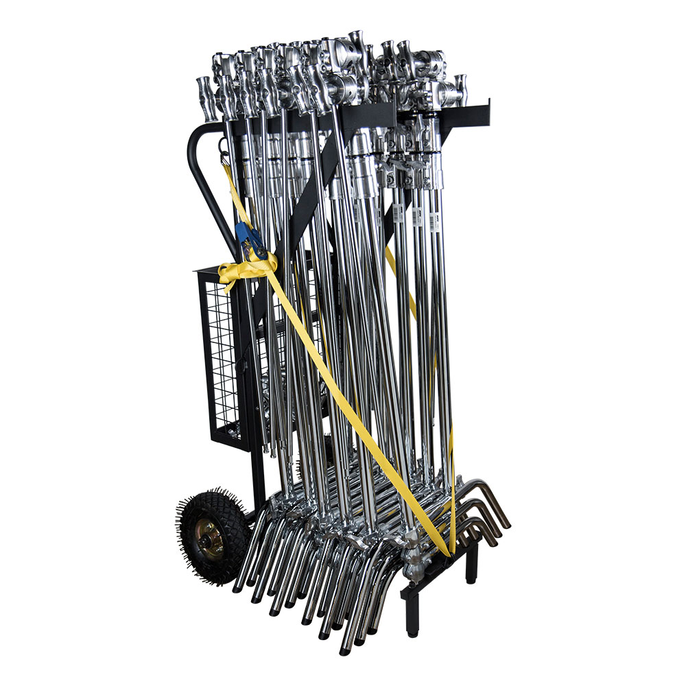 Designed to hold up to 12 set C-stand kits, this rugged steel cart enables the transport and storage of C-stands whether in the studio, on location or in the warehouse. Features ergonomic handles and a pair of 10” pneumatic wheels for easy mobility even fully loaded. There are 3 welded baby pin for gobo arm replacement and supplied with a steel basket offering an extra space for other grip accessories storage.