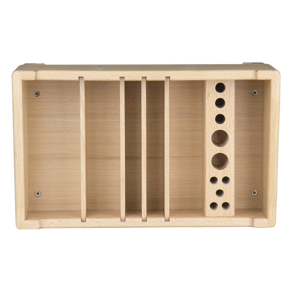 The Kupo camera assistant front box is designed to hold all necessary equipment safely in close proximity while making all the items easy to access. Used primarily by 2nd ac users on set, the Kupo front box can be attached to a tripod or heavy-duty stand (via a convi clamp and front box mounting plate for a convi clamp) and holds items such as markers, cleaning supplies, tools and a standard filming slate movie clapboard. Also available separately is a front box mount for mounting to a fluid head. The Kupo camera assistant front box is made of high-quality european beech and comes witha natural finish. It features four removable and interchangeable dividers to customize your particular needs. The camera assistant front box also features a pen holder that is in a fixed position and includes variously sized holes for pens and essential cine tools. Slots on the underside of the front box conveniently holds a standard sized slate movie clapboard.