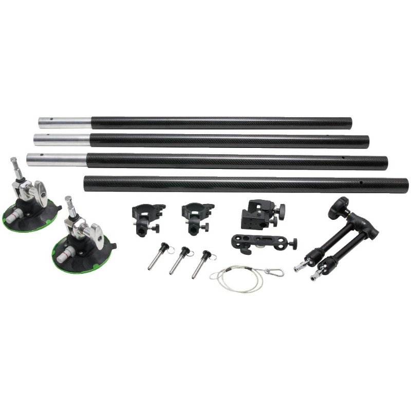 Kupo's car rig shot kit is designed for car photographers for the most effective way to rig shot for capturing a car in motion and blur effects. Designed for photographic or video applications from a dslr or mirrorless camera, not only is a sense of speed achieved, but the interesting angles that would be nearly impossible in panning or tracking makes this rig shot a great tool for car photographers. The kit features a set of carbon fiber tubes that is half the weight and much stiffer than aluminum tubes. The length is extendable from 3.28ft (1m) to 13.12ft (4m) by assembling three male and one female carbon fiber tubes. Three quick-release bottom safety pins are also supplied to make the tubes lock quickly. The mounting solution for the car is provided withtwo 6in pumping suction cups. Two burger couplers withbaby receiver s are designed for efficiently connecting the assembled tubes and suction cups. The car rig shot kit also includes a max arm , convi clamp, and a camera bracket for precise positioning of the camera. All equipment is well stowed in the built-in lid organizer of the zipped carry bag which is made from reinforced double ply nylon to ensure optimal impact protection for the kit.