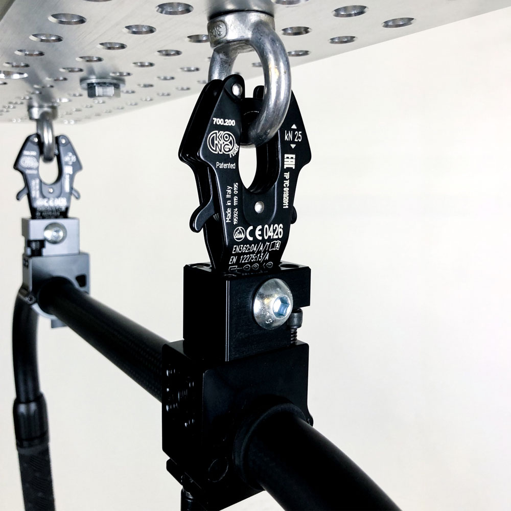 Kupo frog locking carabineer set is a combination by a quick locking carabineer and a mounting coupler for dia.25~30mm gimbal rig or handle bar. This is designed for quick transition from hanging a handheld gimbal rig to jib/crane style shot. (set of 2)