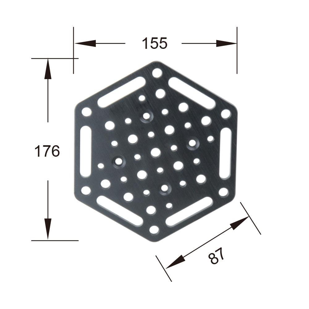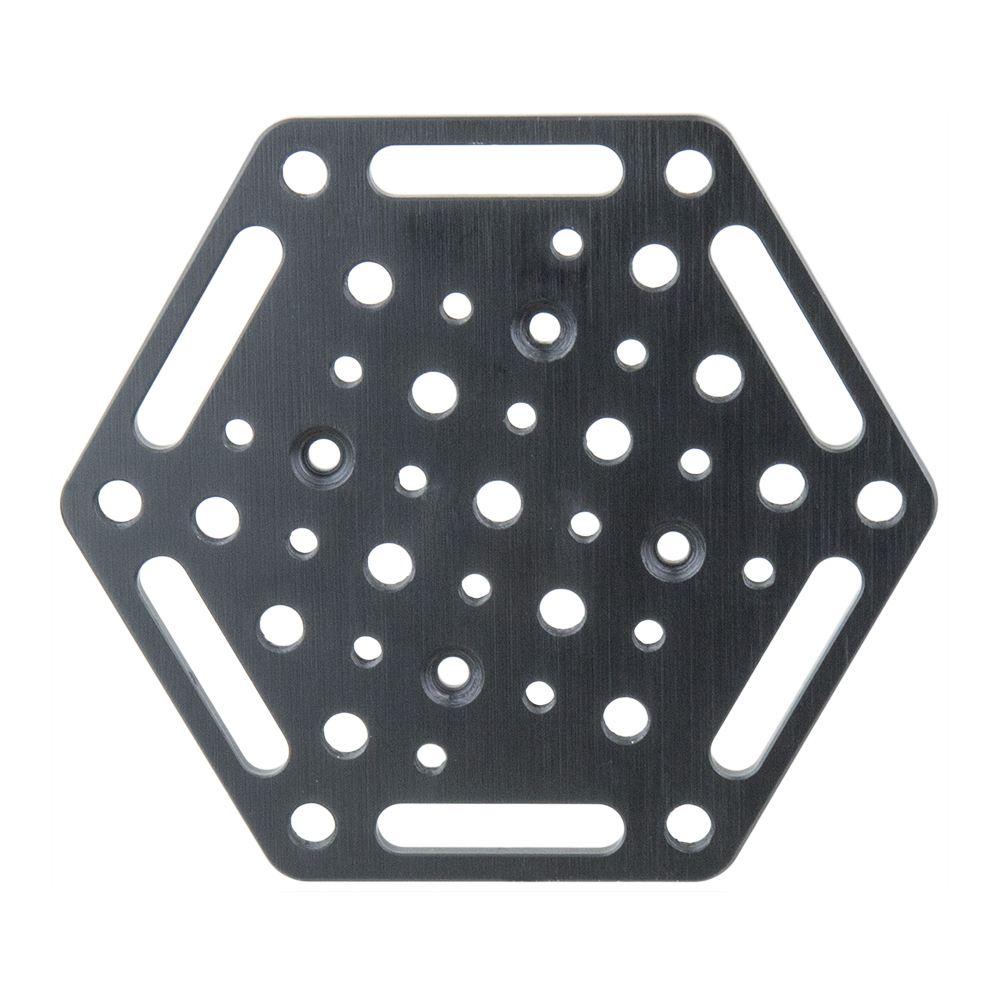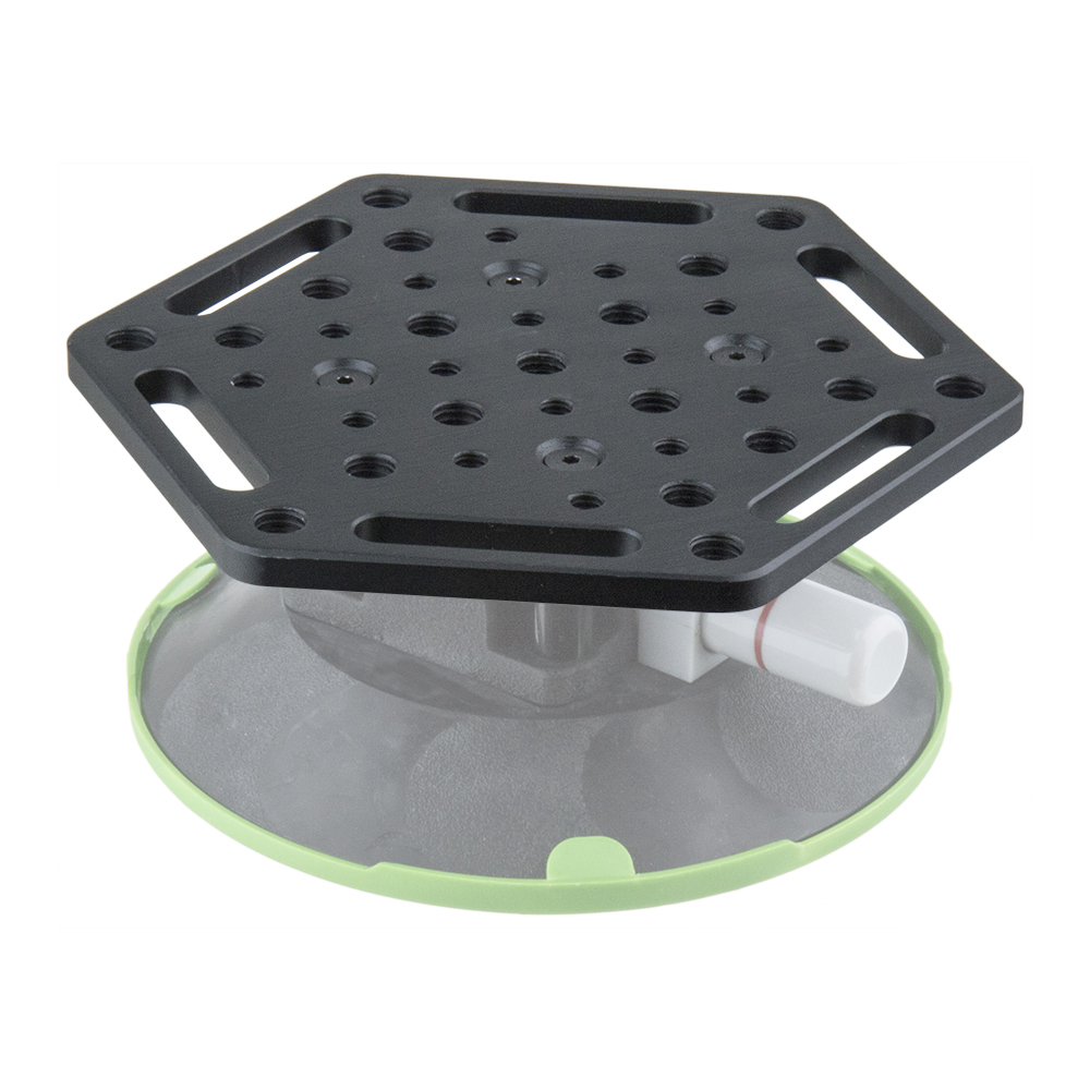 An 8mm thick aluminum alloy plate with black anodized finish, primary designed for mounting on Kupo 6" (or 4.5") suction cup with supplied screws and spacers. Features strap slot alongside the hex plate edge makes it an ideal support point to fasten the straps for car mount rigging. Those 1/4”-20 & 3/8”-16 female threaded and twelve through holes are with 1” center-to-center spacing for match-up to any one inch center grip cheese plate also allows you to mount a variety of video or lighting equipment.