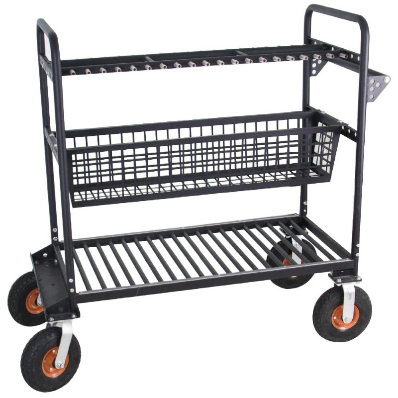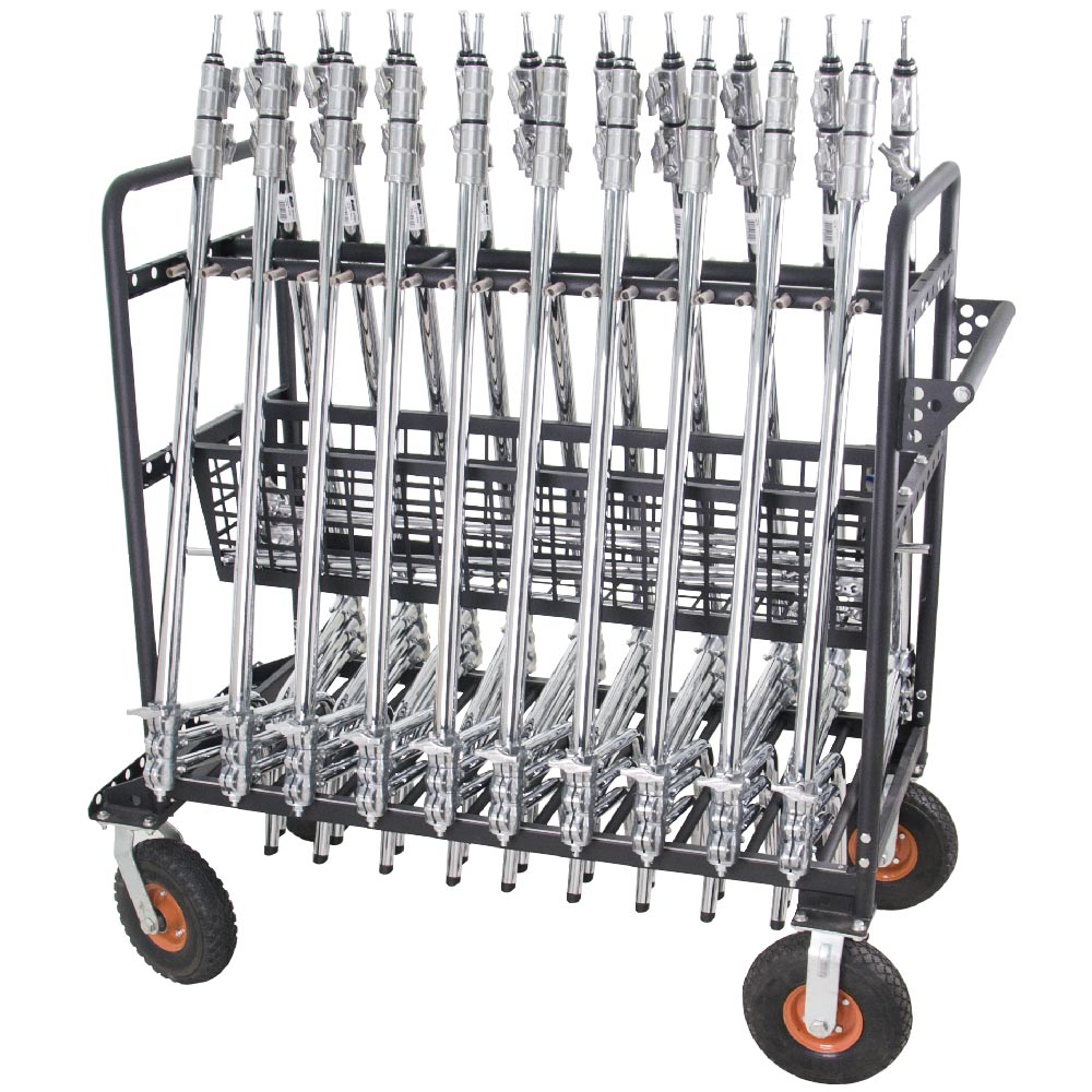 This C-Stand Grip Cart holds up to 20 C-Stands and features a steel basket for the placement of grip arm, grip head and other grip gears. Ergonomic handles and wheels allows to have an easy transportation between various locations with ease and convenience. Cart will also keep the stands tidy and ready for fast use around camera.