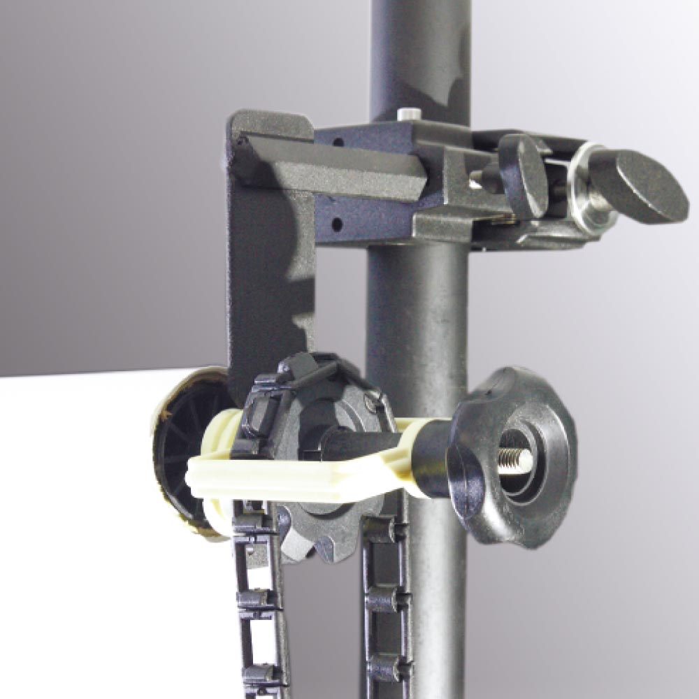 The background paper drive set consists of a pair of adapters designed to securely expand and lock inside the core of a seamless paper roll. One adapter features a plastic cog that accepts a plastic drive chain, allowing easy length adjustment for your background. It also includes a tension control feature, preventing the background from unrolling due to gravity. The set comes with a hanging chain weight to maintain tension. The background paper drive set easily mounts to specially made hooks, offering versatile and convenient mounting options.
