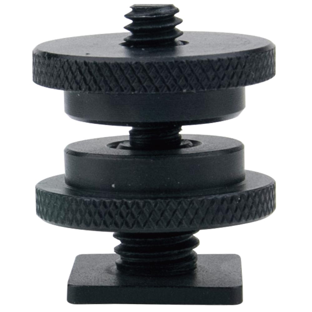This adapter can fit on the hot shoe of most cameras. It terminates with a 3/8’’ to 1/4’’ threaded stud and is used as a Monitor Bracket or anything else that has a 1/4’’ -20 receiver. Two large knurled locking nuts are quipped for easy adjustment of the tension. It comes with a 1/4’’-20 double female barrel adapter as the standard accessory that makes the 1/4’’ -20 receiver is available.