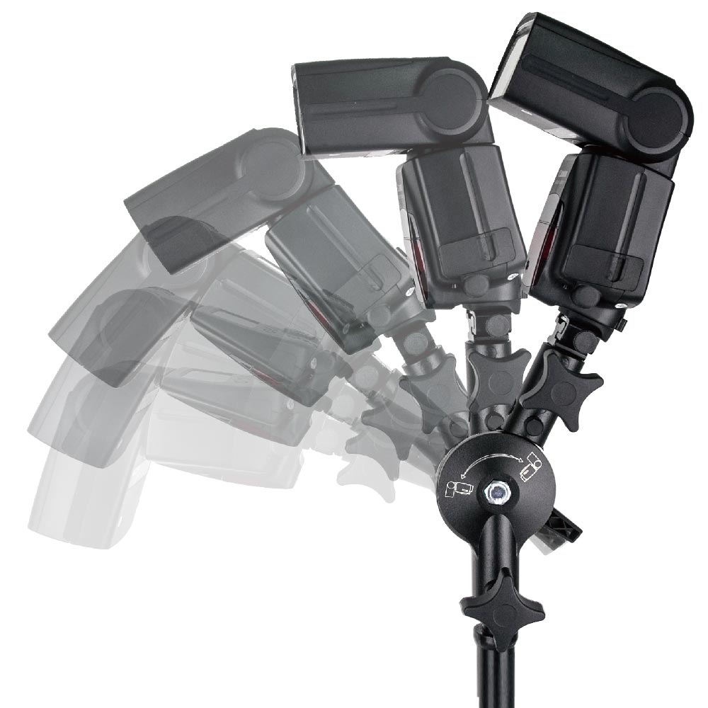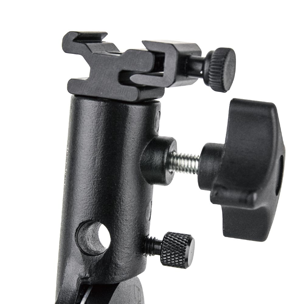 A heavy-duty cast aluminum alloy bracket features a counterbalance mechanism design to prevent your speedlite from flopping over when the knob is loosened. With non-slip aluminum disk equipped between two teeth frictional aluminum brackets and ratcheting locking handle, the speedlite or lighting fixture is able to be locked securely in place and a hole with a knob-screw to lock an umbrella shaft in place. It includes two removable, reversible studs to adapt to light stands with top studs smaller than the standard 5/8”. An universal cold-shoe adapter is included for accepting virtually any shoe-mount flash unit. Additionally, the adjustable locking handle, wide tilt angle, and oversized knobs add to its overall functionality.- Carry pouch with spring hook is included.