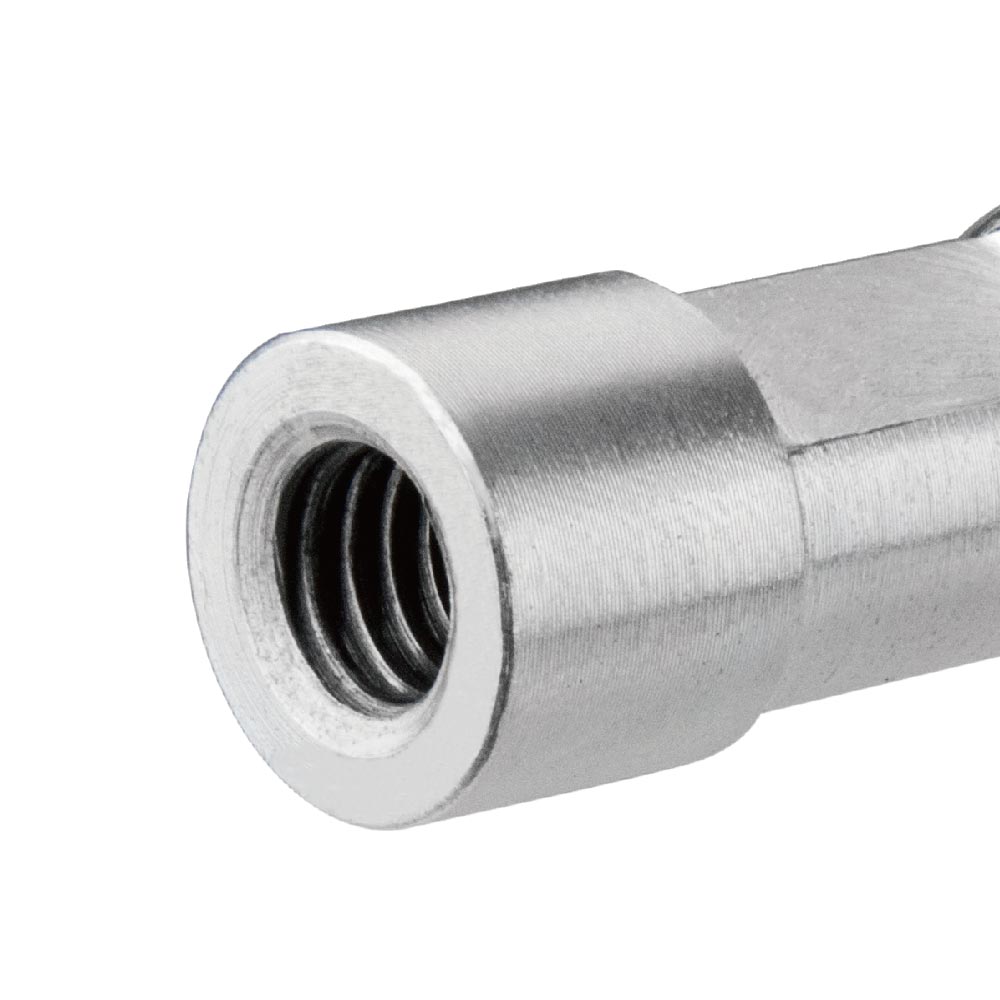 Made by solid steel, this double stud features a knurled neck on one side for the maximum friction and one milled flat on the other to avoid rotating while mounted inside a 5/8” baby receiver. Additional 3/8”-16 female threaded is tapped for connecting with a variety of accessories for video and lighting
