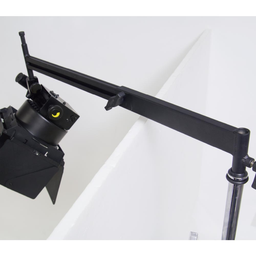 The baby adjustable offset arm extends from 19"-28." mounts on to most stands witha 5/8"-16mm mount. Two baby spigots allow for easy attaching of lights.