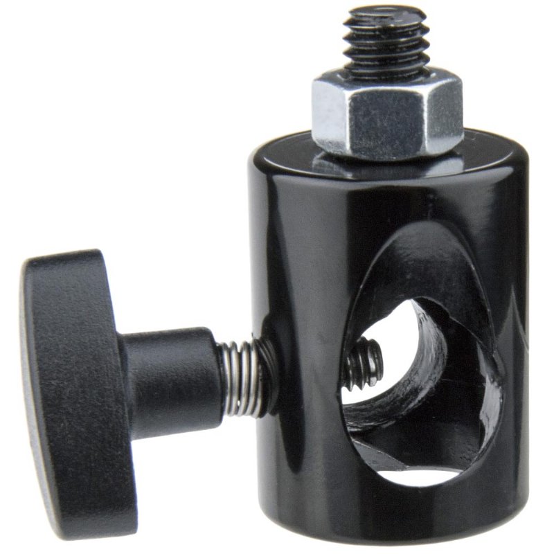 The Kupo 3 Way Mount Baby Adapter is a versatile steel adapter with a black coating designed to securely mount a lighting, flash, or camera with 3/8"-16 female threads onto a 5/8" (16mm) light stand. The locking adapter allows for both vertical and horizontal mounting options. In addition, it features an oblique hole design, providing an additional 35-degree tilt to eliminate barn door interference when positioning a lighting fixture.