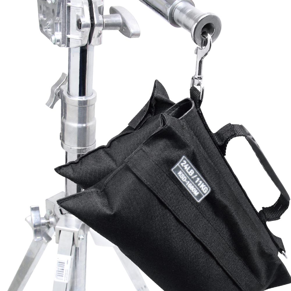 This is a 22.4lb (10.3kg) capacity refillable standbag. Features include : extra rivets combined with double stitching and interior bias binding for maximum strength. Double handle s on both top and bottom provide more comfort. High quality hook and loop closure to assure that the contents stay where the y belong. Metal hanger provides more strength. Stand bags are necessary safety items. The y prevent light stands from tipping over, support a camera and also act as counterweights for booms.