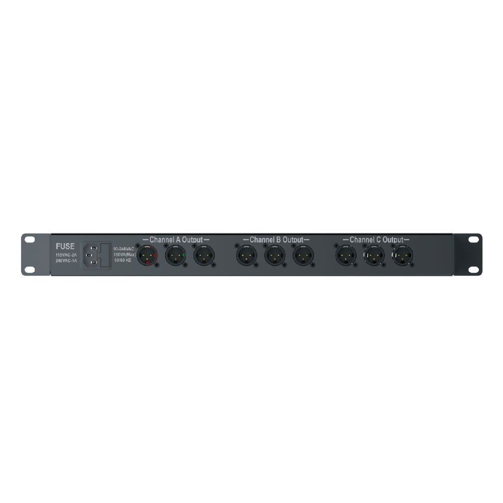 Same as GR-PS01 for working with universal power input (90-240V), this power station powers up to 60 units of belt pack in same time for operation. Three channels A/B/C can be linked up as A+B, or B+C, or put them all together A+B+C for larger group. It is made to fit standard 19” rack. Low profile and compact.