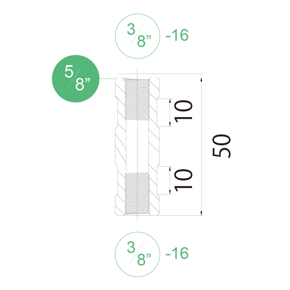 Stainless steel 5/8” (16mm) round adapter comes with 3/8”-16 female threaded in each end.