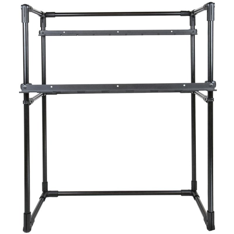 Stand hanger rack constructed from aluminum die-casting super joint connectors, matte black steel tubes and steel hangers offers a great solution for the storage and display for your lighting stands.