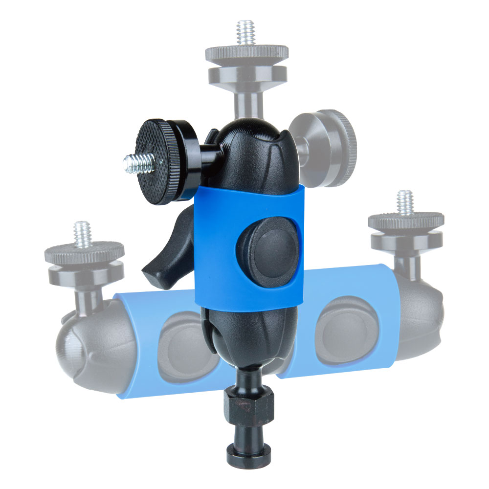 The Kupo super knuckle system is an innovative modular system that features a double-ended shell that accepts two ball joints mounted to interchangeable accessories on eithe r side. The shell has a single knob in the center to tighten both ball joints simultaneously and complete freedom to position accessories anywhere. The super knuckle withbaby receiver can support up to 17.6lbs (8kg) and includes the shell witha 5/8in baby receiver for attachment to accessories witha 5/8in pin, and a locking thumb wheel witha 1/4in-20 male thread on the other for cameras or other gear with1/4in-20 female threads.