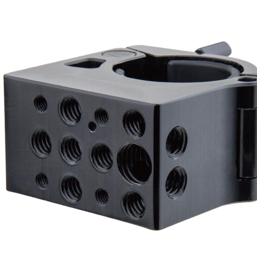 This coupler features a removable rubber pad inside the coupler which allows it to fit any tube size or gimbal handle bar that comes witha 25mm to 30mm diameter. The re are also various threaded holes including 3/8in-16 (2 pcs), 1/4in-20 (7 pcs) and m4 (pcs) on the main base to accept a wide range of adapters, grip accessories, cameras, lights, and monitor arm .