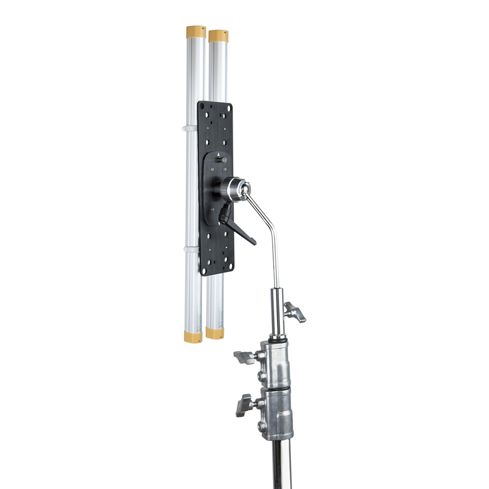 This lightweight twist-lock mounting plate is equipped withtwo pairs of rubberized spring clips allowing it to mount 2 kino flo lamps or t12 lamps. Made of black anodized aluminum, this plate comes with4 dia. 3/8in holes for connecting to the Kupo off-set mounting plate withbaby receiver (kg400212) or to a cheese plate.