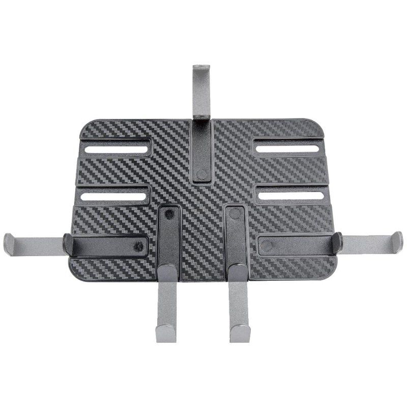Made from reinforced abs material to be strong and lightweight, the super knuckle universal tablet holder comes withrubber coated aluminum hooks that adjust to nine different positions. Fits almost any sized tablet from 7" to 11" on one side and a ball joint on the other.