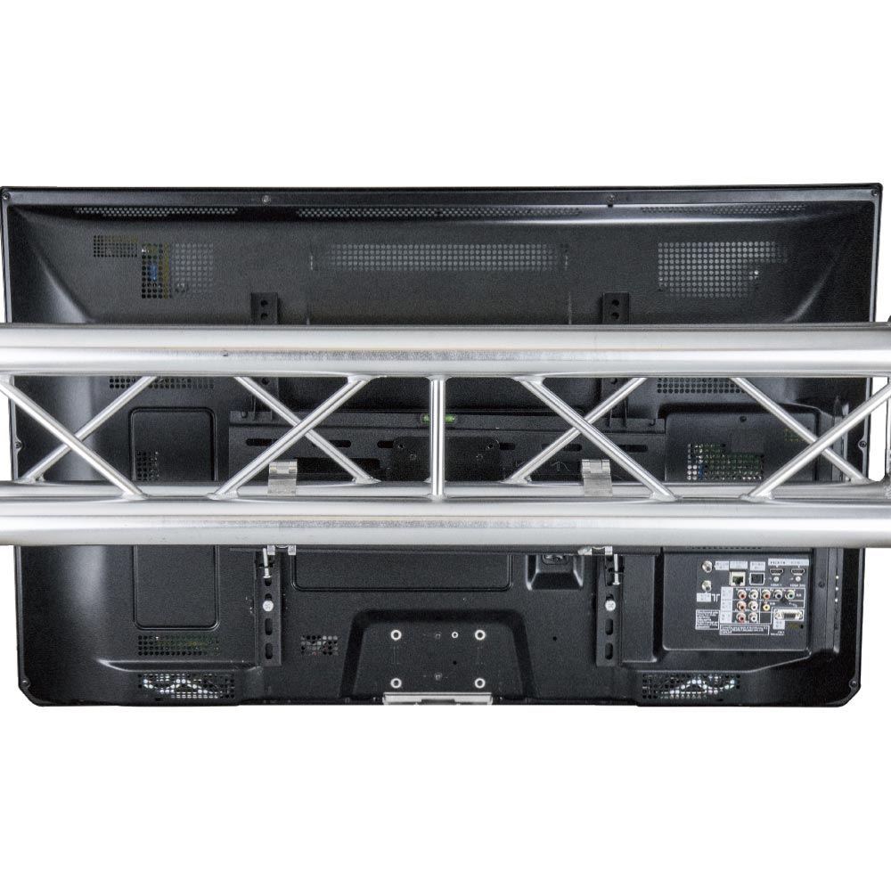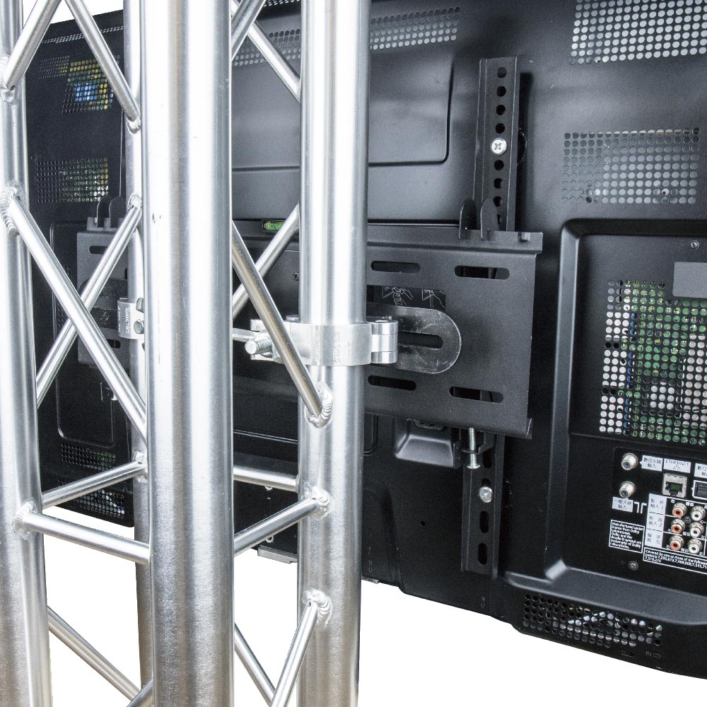 Universal TV tilt truss mount provides the most versatile installation for a flat panel television. This TV truss mount is designed for accommodating large TV screens from 37" to 52", for rigging on 30/40cm truss system. It features 15 degree forward and backward viewing angle adjustments as well as side-to-side positioning after installation. Gliding the brackets on the wall plate groove and buckling up with the safety hook secure the installation firmly. Slim and low profile for tidy appearance. The frame is made of heavy-duty metal with a durable power-coated finish.