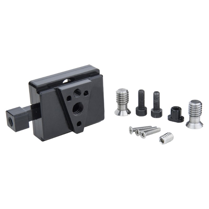 The quick release v-lock set included the wedge and base which are precisely machined from black anodized aluminum with tight tolerances and minimized wiggles. The v-lock wedge can bolt into m3 to the standard v-mount battery or any device comes with 1/4”-20 or 3/8”-16 hole by the supplied screws. V-lock base can also be bolt into m5 to attach on convi clamp by supplied screws and one 3/8” to m5 adapter. The two 3/8”-16 tapped holes on the back is spaced 1” (center to center) allows the base to be mount on any standard cheese plate. The extension handle comes with 1/4”-20 male threaded is able to be mount on the knob allows to extend 25mm long. All the screws listed below are supplied.