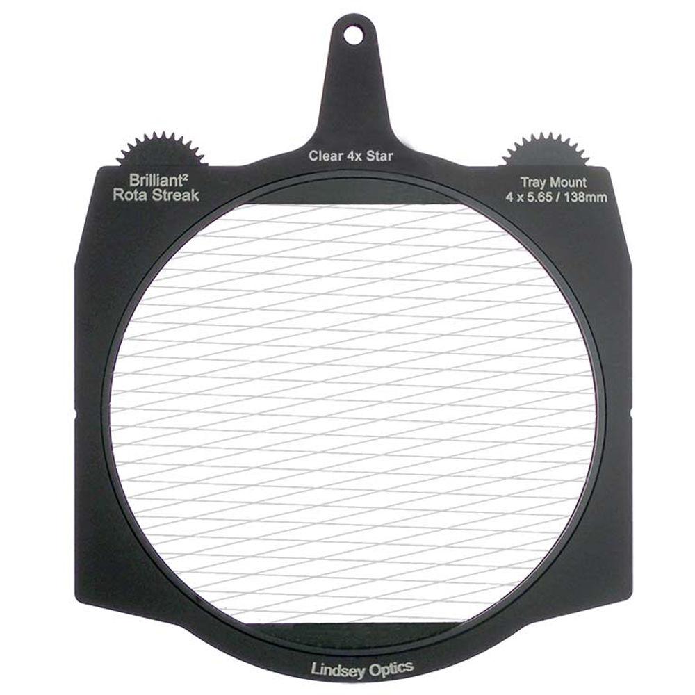 This clear 4-point star Brilliant² 4 x 5.65" Rota-Streak Filter from Lindsey Optics is a 138mm glass filter in a frame made to fit 4 x 5.65" matte boxes. The filter can be rotated manually or by using a motor to position the filter effect in any desired position. It adds an in-camera star effect on bright lights and highlights in a scene.