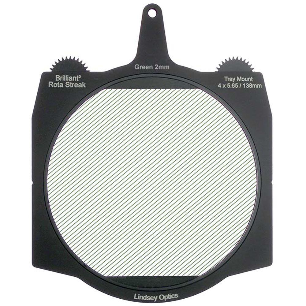This green 2mm 2-point streak Brilliant² 4 x 5.65" Rota-Streak Filter from Lindsey Optics is a 138mm glass filter in a frame made to fit 4 x 5.65" matte boxes. The filter can be rotated manually or by using a motor to position the filter effect in any desired position. It adds an in-camera streak effect on bright lights and highlights in a scene.