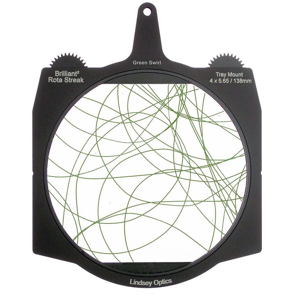 This green swirl Brilliant² 4 x 5.65" Rota-Streak Filter from Lindsey Optics is a 138mm glass filter in a frame made to fit 4 x 5.65" matte boxes. The filter can be rotated manually or by using a motor to position the filter effect in any desired position. It adds an in-camera swirl effect on bright lights and highlights in a scene.