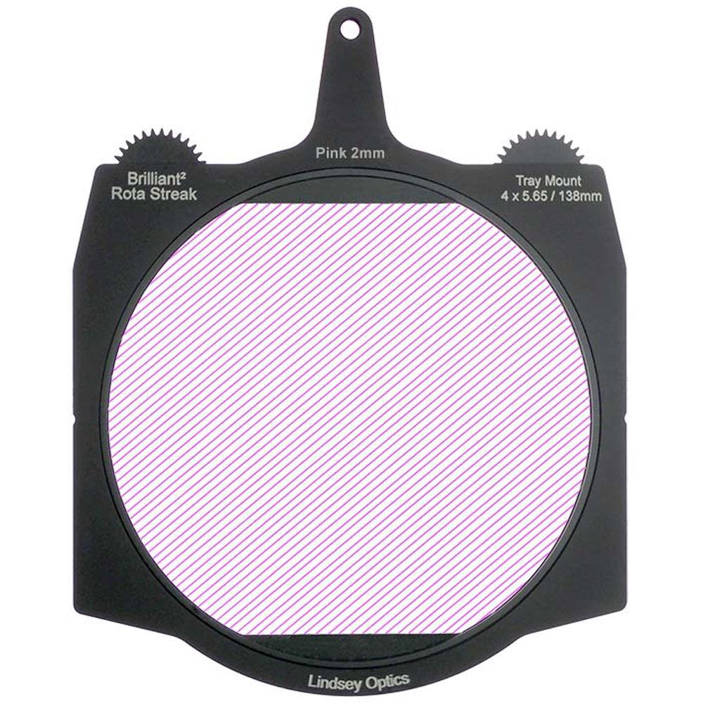 This pink 2mm 2-point streak Brilliant² 4 x 5.65" Rota-Streak Filter from Lindsey Optics is a 138mm glass filter in a frame made to fit 4 x 5.65" matte boxes. The filter can be rotated manually or by using a motor to position the filter effect in any desired position. It adds an in-camera streak effect on bright lights and highlights in a scene.