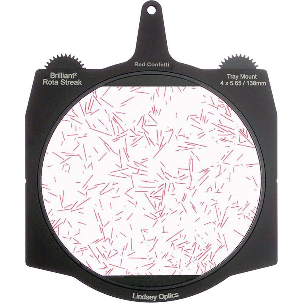 This red confetti Brilliant² 4 x 5.65" Rota-Streak Filter from Lindsey Optics is a 138mm glass filter in a frame made to fit 4 x 5.65" matte boxes. The filter can be rotated manually or by using a motor to position the filter effect in any desired position. It adds an in-camera confetti effect on bright lights and highlights in a scene.